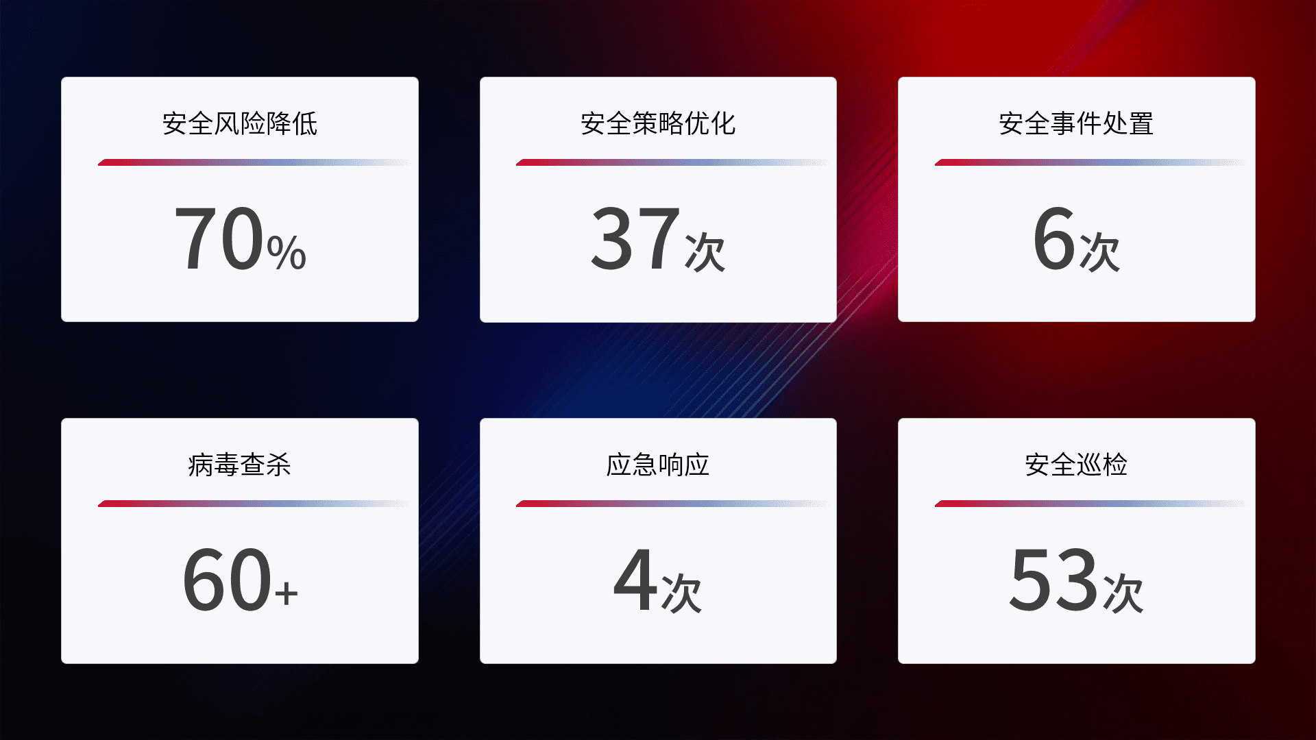 提供全面的安全事件报告体系,,,,包括处置报告、、、、周报、、、、季度和年度总结,,,,结合持续监控,,,帮助客户深入了解网络安全状况。。。